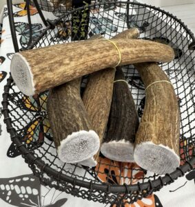 If Rocket doesn’t have a beef cheek roll or a collagen chew, he will often dig an elk antler out of the toy basket. They’re hard on the outside and have porous bone marrow on the inside. I never buy the split antlers, only the whole ones. If your dog is a power chewer, be careful; antlers are very hard and may cause cracked teeth. (I purchase them at Flying Colors. We can keep the price low because we buy directly from the farm.)