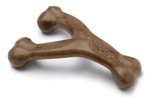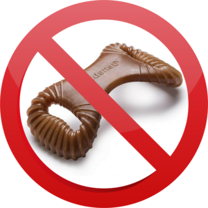 These are made of hard plastic and don’t add calories. They’re designed for a piece the size of a grain of rice to come off at a time, and those small pieces pass through the gut with no problem. All four of my dogs like to chew on these, and have a STRONG preference for the wishbone shape. It’s important to note that since Benebones and Nylabones aren’t made of an animal, some dogs don’t instinctively chew them. I have a very simple way to teach dogs to gnaw on these types of chews (check out the blog: Nylabone Magic). Similar to elk antlers, be careful with power chewers who may crack teeth on the hard plastic.